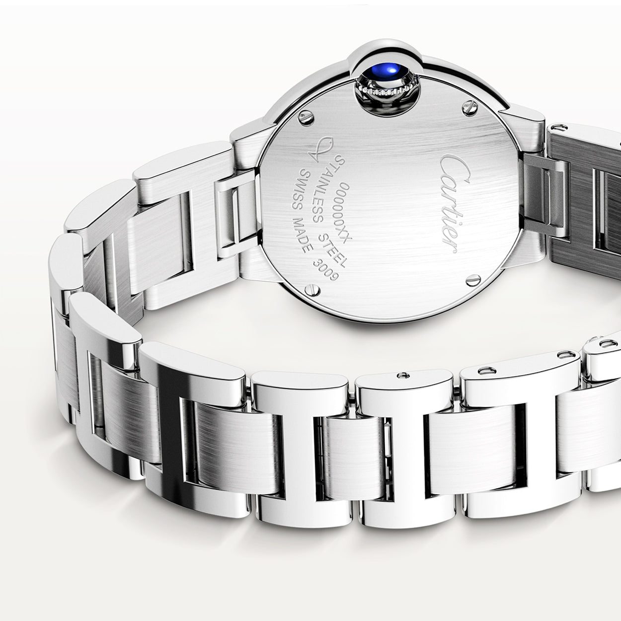 Cartier Ballon Bleu de Cartier 28mm Diamond Bezel Watch W4BB0030. Stainless steel 28mm case and diamond set bezel (0.48ct) all on a steel bracelet. This ladies watch features a silver dial with blued steel hands and black hour numerals. Water resistant up to 30m and sapphire crystal glass. Quartz movement.