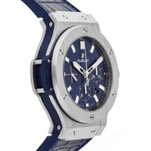 Hublot Big Bang, Steel Blue Chronograph Automatic 44mm watch, Stainless steel case with brushed and polished finishes, Reference 301.SX.7170.LR. Case center (edge) with lateral blue inserts. This model has Blue Sunray Satin-finished dial with applied brushed finished stainless steel “applique” style alternating Arabic Numerals and Index hour markers. Brushed finished stainless steel hands with luminous filled tips (minutes and hours hands semi-skeleton). White printed minute track with 5-minute Arabic numerals intervals on the outer perimeter of the dial. Chronograph stopwatch functions: Large red central seconds counter with the “H” logo as a counter-weight; 30-minute sub-dial counter located at the 3 o’clock position; 12-hour sub-dial counter located at the 6 o’clock position. Small running seconds sub-dial hand located at the 9 o’clock position. Date window located between the 4 and 5 o’clock position. Stainless steel Push / pull Crown and chronograph buttons have blue rubber centers/inserts. Crown has the Hublot logo. The dial closed by a Scratch-resistant Sapphire Crystal with Anti-reflective Treatment. Of Sapphire Crystal made transparent case back. The watch is equipped fixed vertical satin-finished Stainless steel bezel with a ridged edge with 6 immediately recognizable H-shaped Titanium Screws. The watch is Hublot Caliber HUB 4100 automatic movement, contains 28 Jewels and has an approximate power reserve of 42 hours. This model presented on a blue rubber strap with a stiched blue alligator leather top with Stainless Steel Deployant Buckle Clasp. The water resistance is up to 100m/330ft (10 ATM).