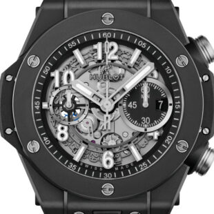 Hublot Big Bang Unico Black Magic, 44mm watch, microblasted and polished black ceramic case, Reference 421.CI.1170.RX. Case sides and bezel base black composite resin inserts. This model has Matte Black Skeleton Dial with “Applique” style alternating Arabic Numerals and index hour markers with luminous fill. Raised/tapered black inner bezel flange on the perimeter of the dial with white printed minute/seconds track and printed 5 seconds increments in Arabic numerals. The minute and hour hands with luminous filled tops and skeletonized bottoms. Date window with white background located at the 3 o’clock position. Small running seconds sub-dial hand located at the 9 o’clock position. Chronograph/Stopwatch functions: column wheel chronograph; Flyback function, allows for instant restarting of the chronograph with a single push of the button; large central seconds counter hand; 60-minute counter sub-dial located at the 3 o’clock position. The chronograph is adjusted using Titanium round shaped buttons. Titanium crown with function Screw down with black rubber around for enhanced grip. The dial closed by a Scratch-resistant Sapphire Crystal with Anti-reflective Treatment. Of Sapphire Crystal made transparent case back. The watch is equipped fixed microblasted and polished black ceramic bezel, secured 6 immediately recognizable Hublots signature “H” screws style of Titanium. The watch is Hublot Caliber UNICO 2 HUB1280 Manufacture Self-winding Chronograph Flyback Movement with Column Wheel, contains 43 Jewels and has an approximate power reserve of 72 hours. This model presented on a black Structured Lined Rubber Straps with Black Ceramic and Titanium Deployant Buckle Clasp. Straps are easily interchangeable via the quick-release buttons, located on the top and bottom central lugs (this watch is delivered with a single strap only). The water resistance is up to 100m/330ft (10 ATM).