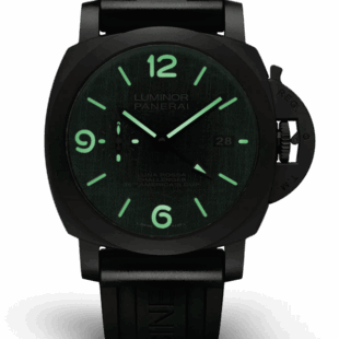 Unworn Men’s Watch Panerai Luminor Luna Rossa GMT – 44mm, of black DLC titanium case, Reference PAM01036. The model has Dark grey sail dial with polished black hands with luminous fill. This watch is engraved hour markers in a combination of Arabic Numerals in the 6, 9, and 12 o’clock positions and indexes with luminous fill. Small seconds sub-dial located at the 9 o’clock position, with bold luminous 15 seconds markers. A small red luminous leaf-shaped hand is used for the small seconds sub-register. This Officine Panerai signature element speaks innovation and seamless function. Date window located 3 o’clock position. The dial closed by a Scratch-resistant Sapphire Crystal. The watch has Panerai’s (protected as a trademark) instantly recognizable crown protector of Black DLC titanium and screw down Pull/push crown DLC titanium with a ribbed edge for a comfortable grip. They have case shape Round and a Solid case back in titanium with black coating and Engraved. The watch is equipped fixed Black DLC titanium bezel. The Model comes with Automatic mechanical movement Panerai Caliber P.9010/GMT contains 31 Jewels and has an approximate power reserve of 72 hours. The watch presented on a Black Calf Ponte Vecchio strap with secured by a black DLC-coated titanium large-sized Tang Buckle. The water resistance is up to 300m/1000ft.