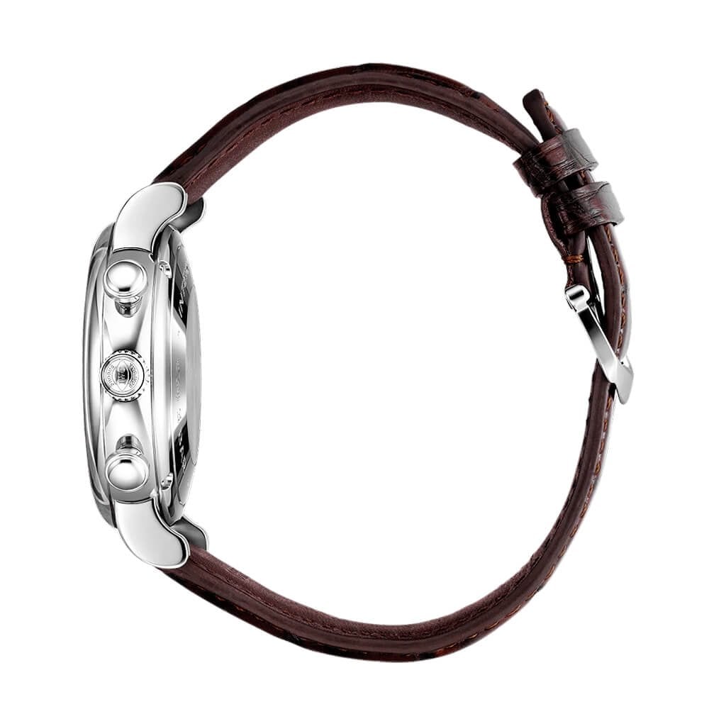 The Portofino Chronograph 39 watch for men conveys a subtle hint of nostalgia within its retro design, thanks to a bicompax chronograph layout with counters positioned on a north-south axis. At the 12 o’clock location, the automatic chronograph Calibre 79350 offers a 30-minute counter at 12 o’clock, balanced by a small second counter. The self-winding engine produces a power reserve of 44 hours and sits inside a 39mm stainless steel case integrated with 30-meter water resistance. The top of the case Features a protective convex layer of anti reflective sapphire crystal glass for shielding the surface of the Portofino watch’s classic black dial. The display also Features golden feuille hands and elegant stick hour markers. The men’s IWC Schaffhausen Portofino Chronograph 39 watch is fitted on a traditional dark brown Santoni alligator leather strap with a stainless steel fastening.